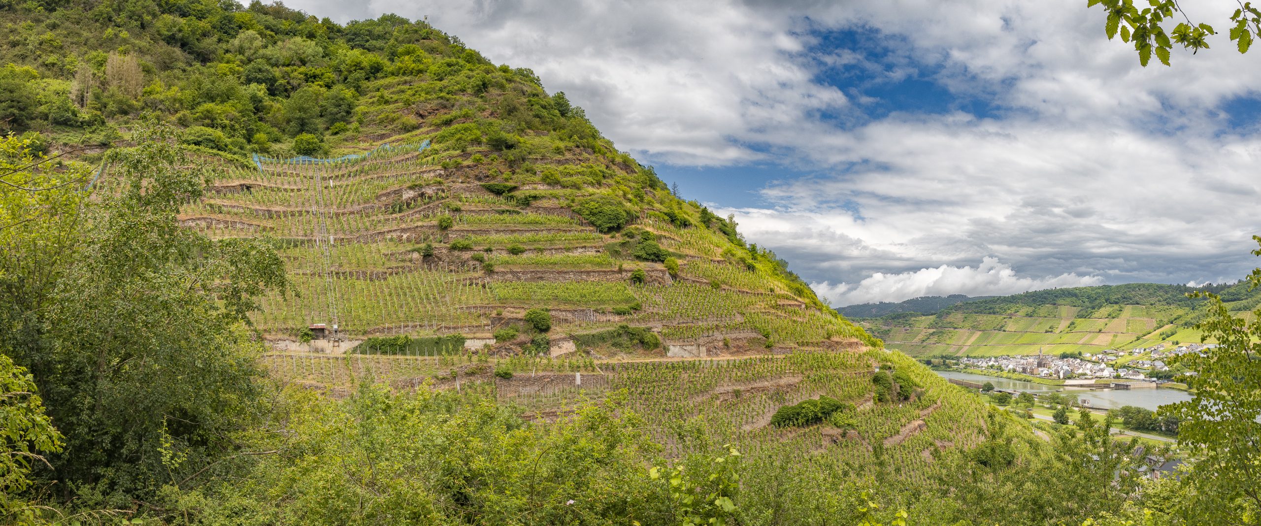 Die Palmberg Terrassen liegen nach Süd / Südost ausgerichtet geschützt in einem Seitental über Sankt Aldegund und sind ein einmaliges Naturdenkmal. In dieser extremen, komplett terrassierten Steilstlage mit einer Hangneigung von über 60 Grad und zahllosen Trockenmauern wachsen auf ca. 1,1 Hektar 70 – 100jährige wurzelechte Rieslingreben. Diese treiben ihre Wurzeln bis zu zehn Meter tief in den besonders mineralreichen, steinigen Untergrund aus grauem und blauem Schiefer um an Nährstoffe und Wasser zu gelangen. In dem sehr arbeitsintensiven Weinberg wachsen die Rebstöcke in Einzelpfahlerziehung und liefern bei sehr niedrigen Erträgen besonders extraktreiche, außergewöhnlich langlebige Rieslinge aller Qualitätsstufen, dazu gehören elegant trockenen Kabinette, vollmundig trockene und feinherbe Spätlesen und je nach Jahrgang opulente, edelsüße Auslesen.