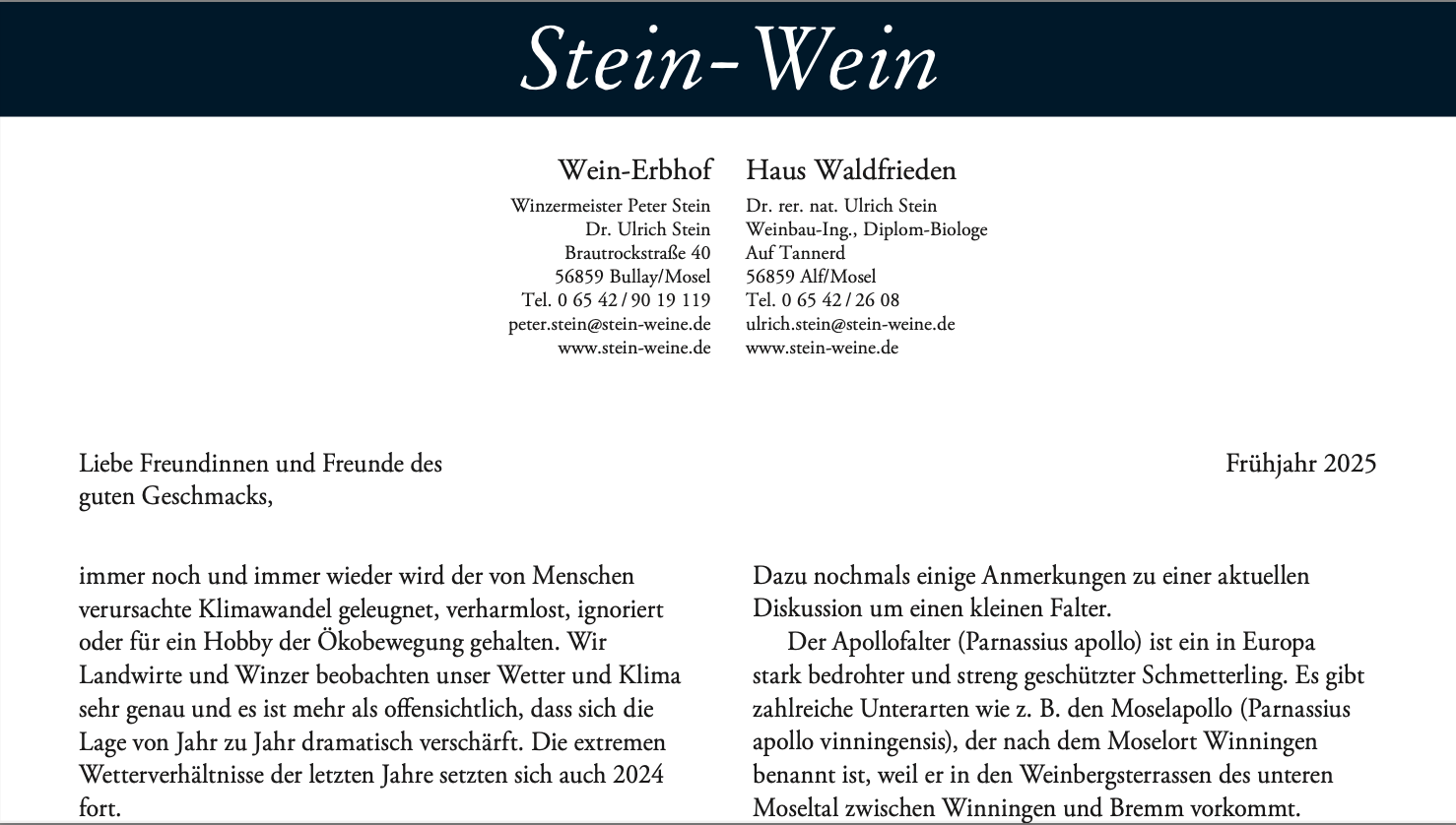 Seit 1975 schreibt Ulli Stein seinen Weinbrief, der in jedem Frühjahr mit Spannung erwartet wird. Das letzte Weinjahr wird beschrieben, der neue Jahrgang vorgestellt und immer geht es auch um Themen, die die Weinwelt allgemein tangieren.